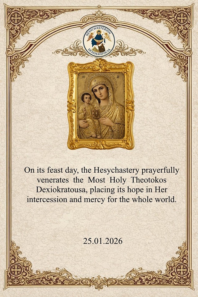 On its feast day, the Hesychastery prayerfully venerates the Most Holy Theotokos Dexiokratousa, placing its hope in Her intercession and mercy for the whole world.